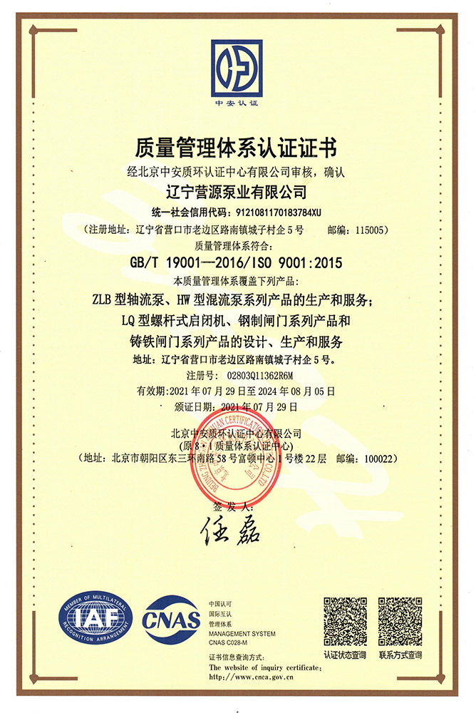 遼寧營源泵業有限公司始建于1995年,位于渤海之濱、遼河岸畔,東臨沈大高速公路、南靠營口鲅魚圈新港、北臨京沈高速公路,公司距營口高鐵站15公里距營口機場20公里,地理位置優越,海陸空交通極為方便。公司主導產品是各種規格農業水利及市政排污用軸流泵、混流泵、潛水軸流泵、漂浮式軸流泵、移動式泵站、集裝箱式泵站、QJ系列井用潛水電泵、螺桿式啟閉機、固定卷揚式啟閉機、平面鑄鐵閘門、中型鋼制閘門、GGD-YY型交流低壓配電柜。